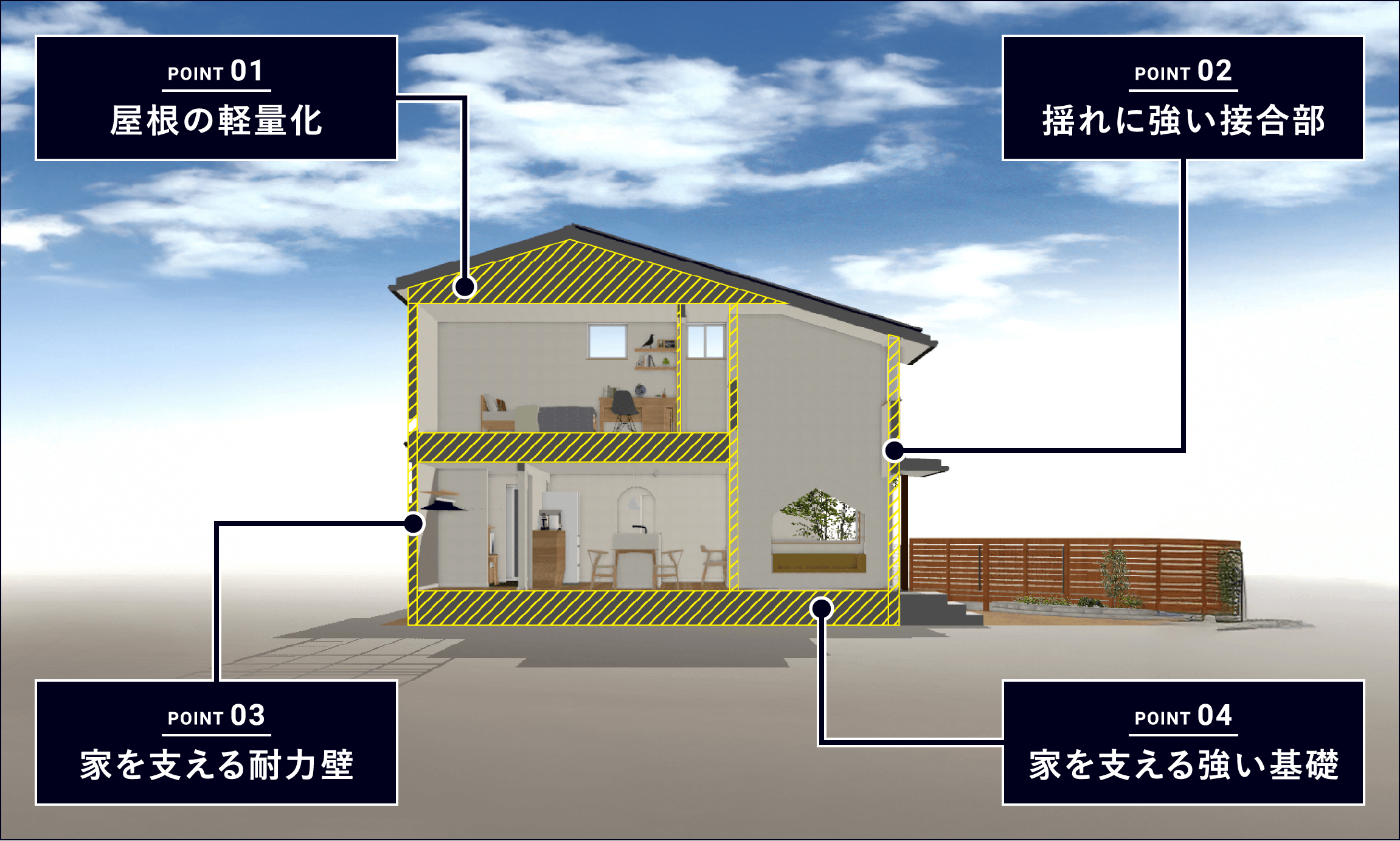 その他、天井・床を解体せず施工可能な耐力面材も使用します。これらを建物全体で見たときに強度が偏らないようにバランスよく配置して揺れに強い住まいにします。